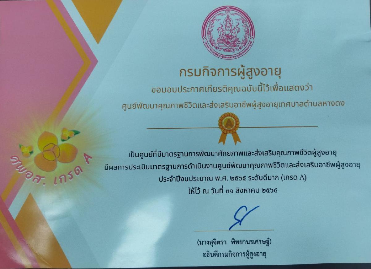 รางวัลศูนย์พัฒนาคุณภาพและส่งเสริมอาชีพผู้สูงอายุที่มีผลการประเมินมาตรฐานศูนย์พัฒนาคุณภาพชีวิตและส่งเสริมอาชีพผู้สูงอายุ ประจำปีงบประมาณ 2565 ระดับดีมาก เกรด A