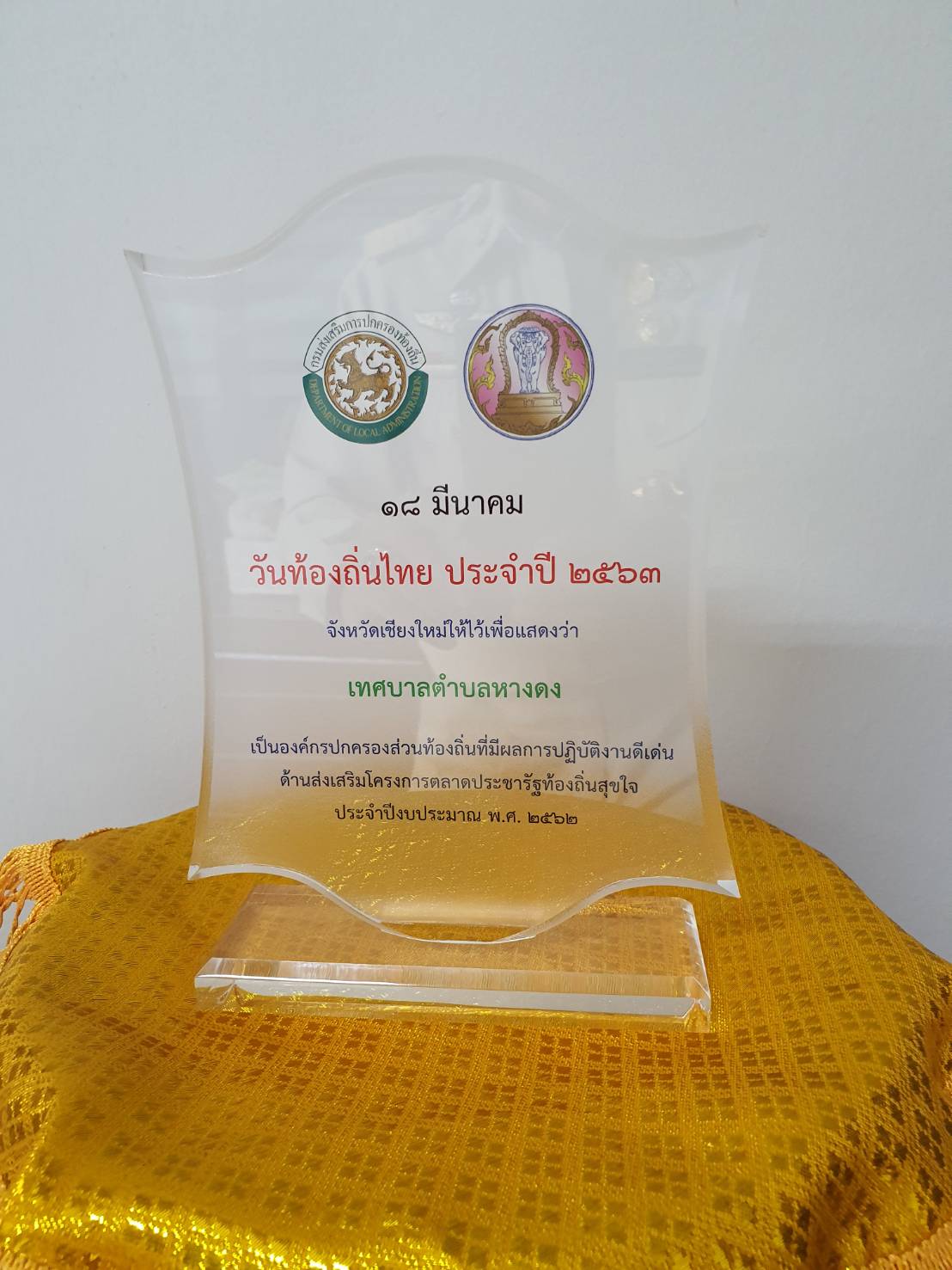 เทศบาลตำบลหางดง ได้รับรางวัลรางวัลองค์กรปกครองส่วนท้องถิ่นที่มีผลการปฏิบัติงานดีเด่นด้านส่งเสริมโครงการตลาดประชารัฐท้องถิ่นสุขใจ ประจำปีงบประมาณ พ.ศ. 2562
