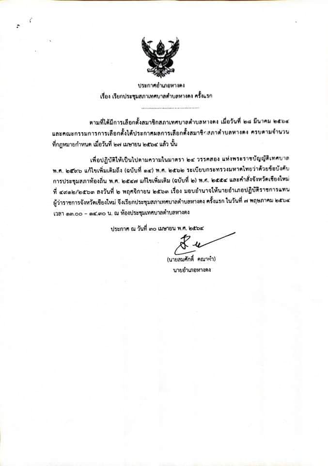 ประกาศเทศบาลตำบลหางดง เรื่อง เรียกประชุมสภาเทศบาลตำบลหางดง ครั้งแรก