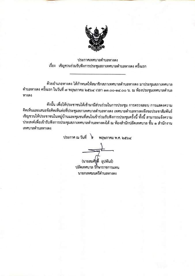 ประกาศเชิญร่วมรับฟังการประชุมสภาเทศบาลตำบลหางดง ครั้งแรก