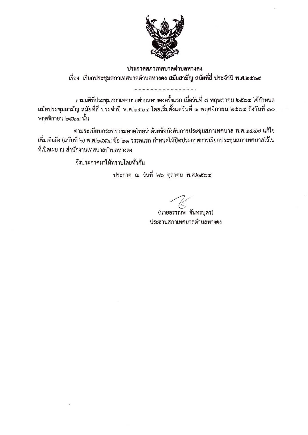 ประกาศเทศบาลตำบลหางดง เรื่อง เรียกประชุมสภาเทศบาลตำบลหางดง สมัยสมัญ สมัยที่สี่ ประจำปี พ.ศ. 2564