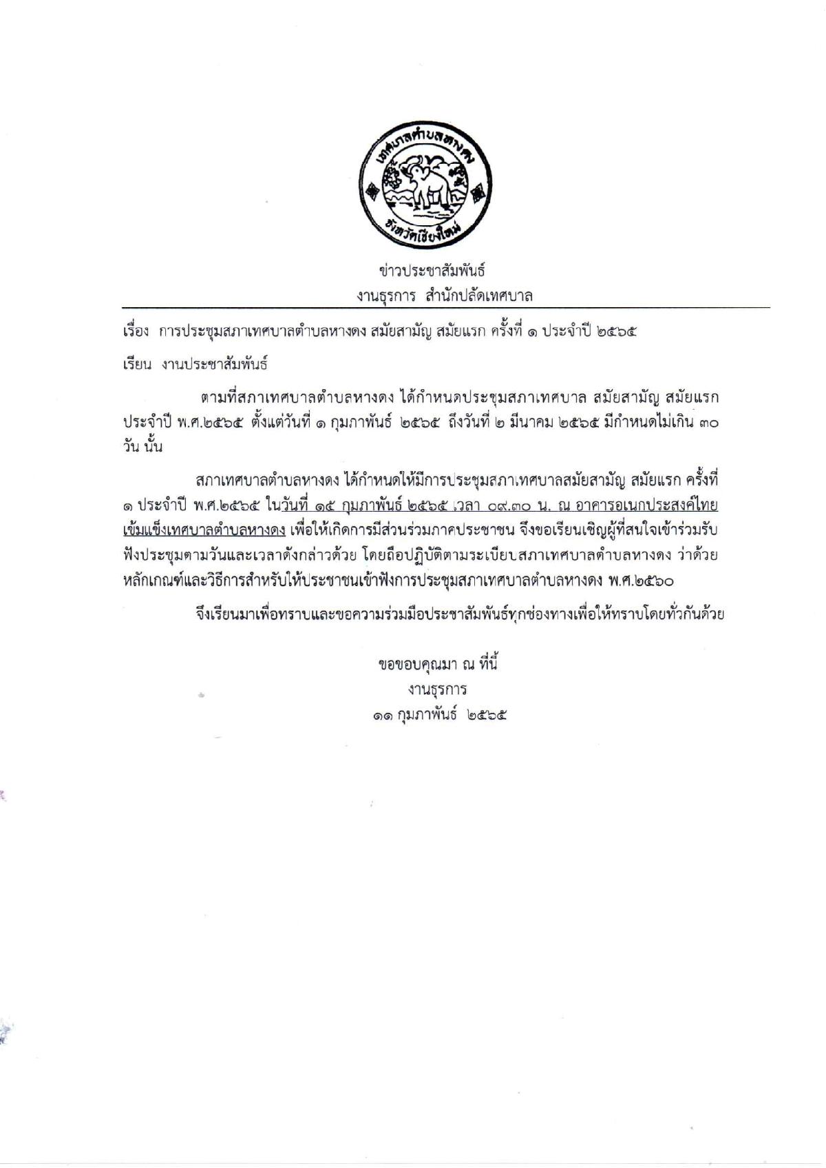 ประกาศประชาสัมพันธ์เชิญเข้าร่วมการประชุมสภาเทศบาลตำบลหางดง สมัยสามัญ สมัยแรก ครั้งที่ 1 ประจำปี 2565
