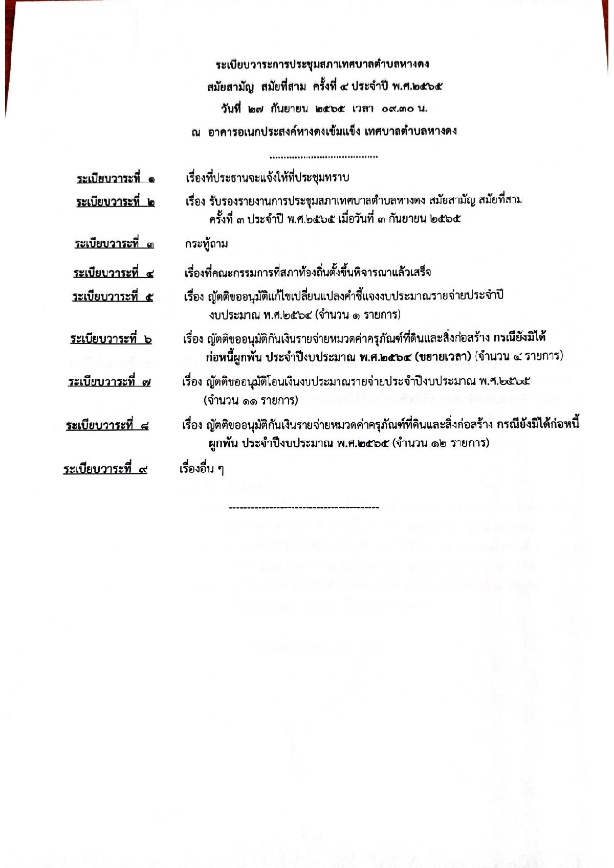 ระเบียบวาระการประชุมสภาเทศบาลตำบลหางดง สมัยสามัญ สมัยที่สาม ครั้งที่ 4 ประจำปี 2565