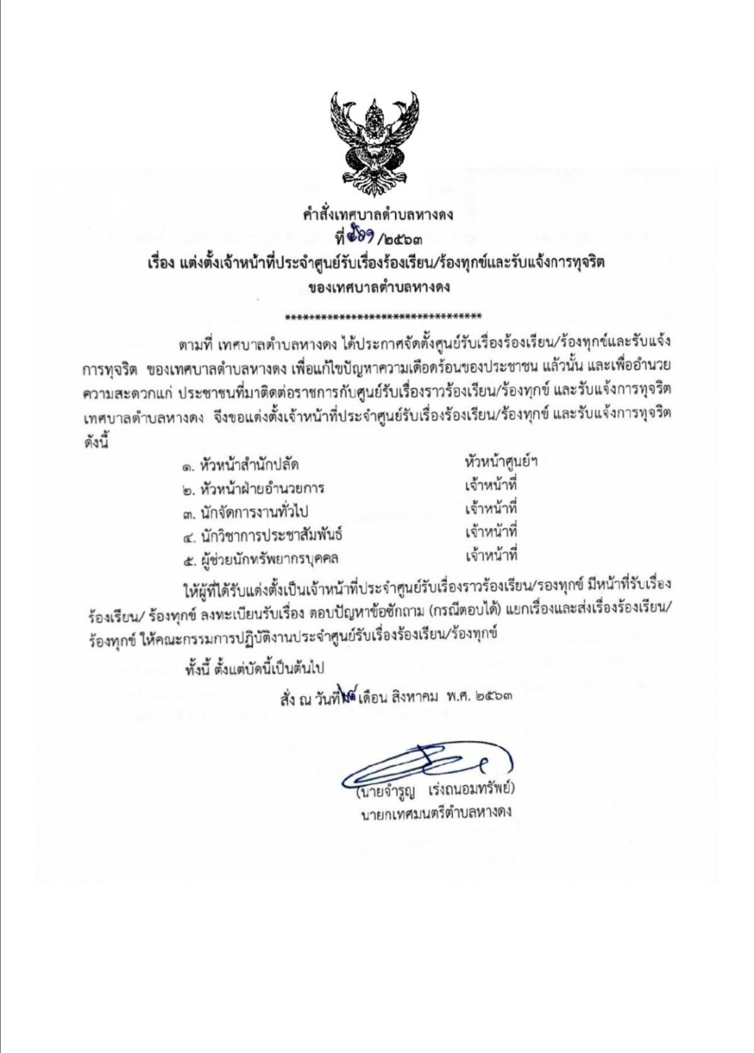 คำสั่งเทศบาลตำบลหางดง เรื่อง แต่งตั้งเจ้าหน้าที่ประจำศูนย์ร้องเรียน/ร้องทุกข์และรับแจ้งการทุจริต เทศบาลตำบลหางดง