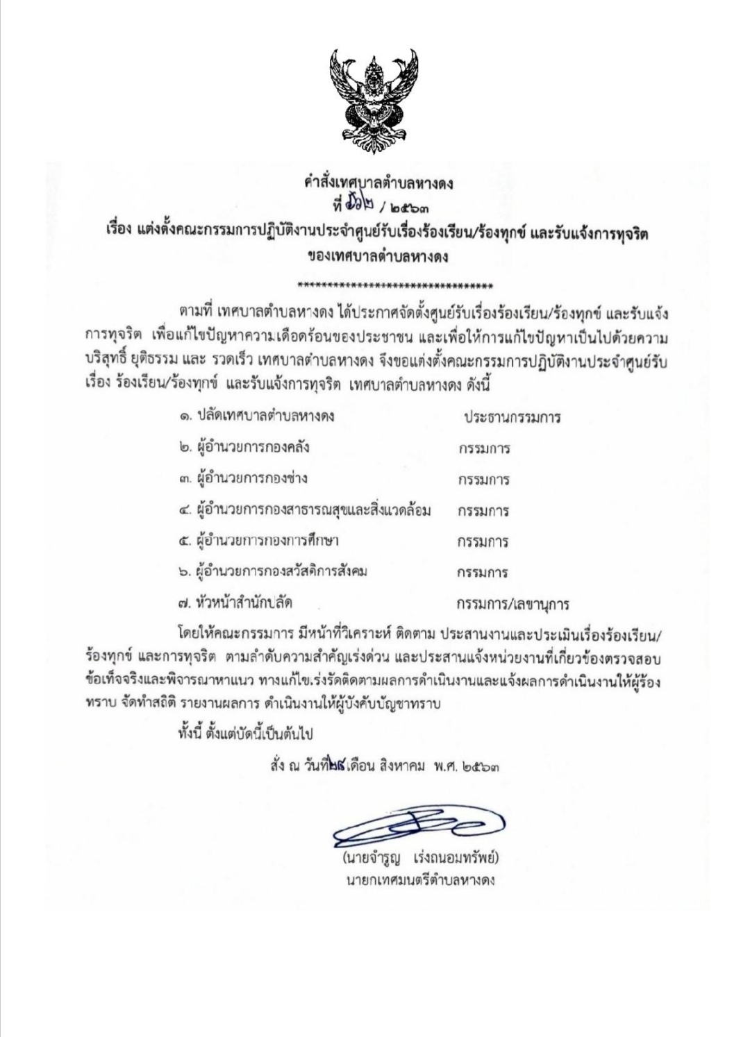 คำสั่งเทศบาลตำบลหางดง เรื่อง แต่งตั้งคณะกรรมการปฎิบัติงานประจำศูนย์รับเรื่องร้องเรียน/ร้องทุกข์และรับแจ้งการทุจริต เทศบาลตำบลหางดง