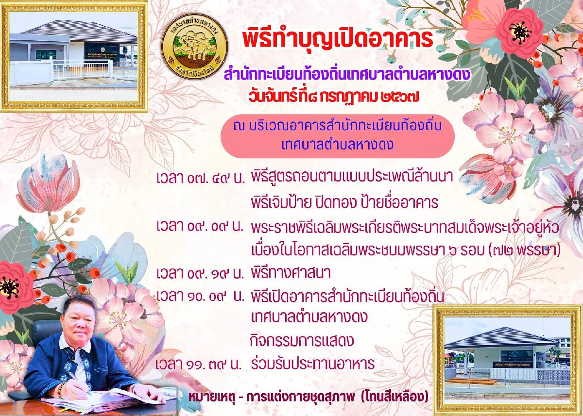 เทศบาลตำบลหางดงจะจัดพิธีเปิดอาคารสำนักงานทะเบียนท้องถิ่นเทศบาลตำบลหางดง (แห่งใหม่) ในวันจันทร์ที่ 8 กรกฏาคม 2567 นี้ สำหรับสำนักงานทะเบียนท้องถิ่นเทศบาลตำบลหางดง (แห่งใหม่) นั้น เทศบาลตำบลหางดง ได้ดำเนินการก่อสร้าง โดยมีวัตถุประสงค์เพื่อเป็นการดำเนินการเชิงรุกและรองรับปริมาณของประชาชนผู้มาขอรับบริการในด้านทะเบียนราษฎร ให้มีความสะดวก รวดเร็ว และมีประสิทธิภาพ ตอบสนองต่อความต้องการของประชาชนมากยิ่งขึ้น