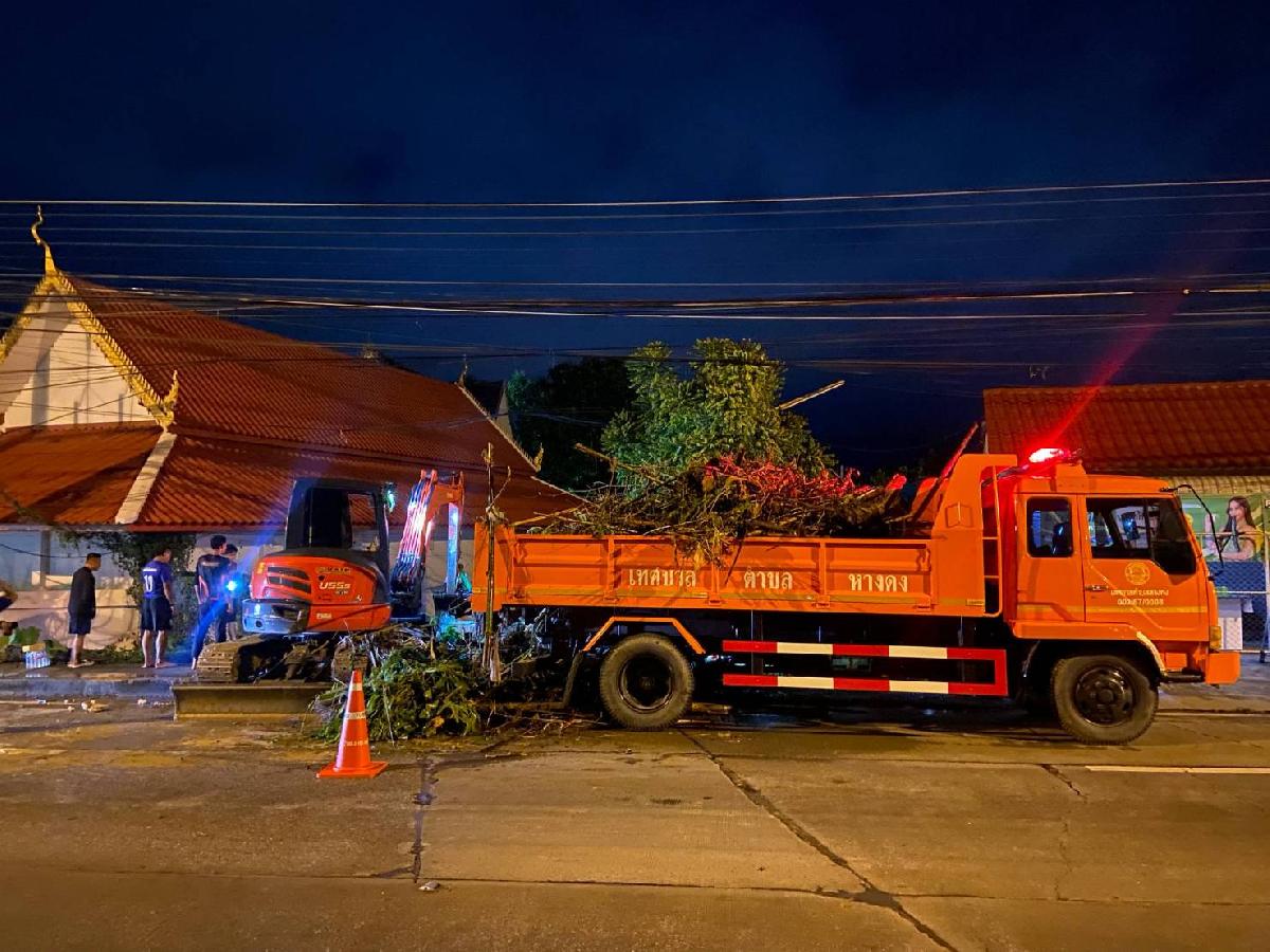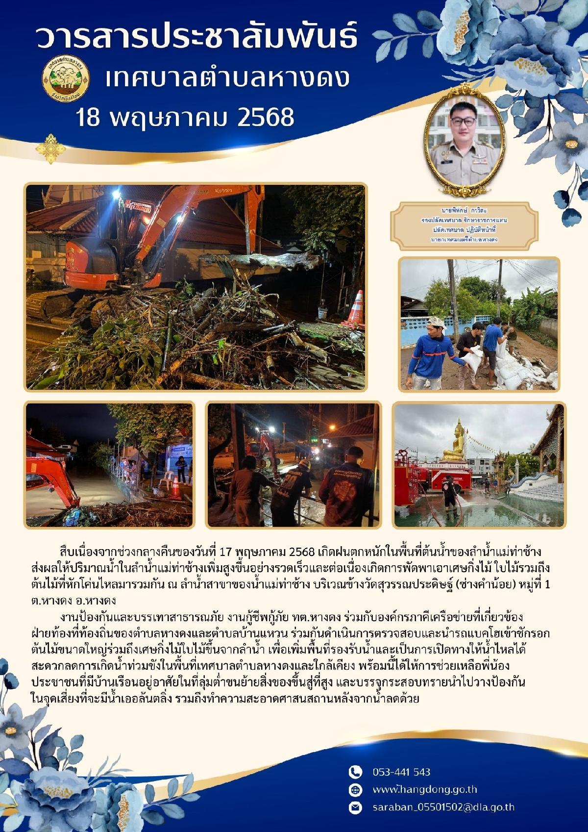 งานป้องกันและบรรเทาสาธารณภัย งานกู้ชีพกู้ภัย ทต.หางดง ร่วมกับองค์กรภาคีเครือข่ายที่เกี่ยวข้องฝ่ายท้องที่ท้องถิ่นของตำบลหางดงและตำบลบ้านแหวน ร่วมกันดำเนินการตรวจสอบและนำรถแบคโฮเข้าชักรอกต้นไม้ขนาดใหญ่ร่วมถึงเศษกิ่งไม้ใบไม้ขึ้นจากลำน้ำ เพื่อเพิ่มพื้นที่รองรับน้ำและเป็นการเปิดทางให้น้ำไหลได้สะดวกลดการเกิดน้ำท่วมขังในพื้นที่เทศบาลตำบลหางดงและใกล้เคียง พร้อมนี้ได้ให้การช่วยเหลือพี่น้องประชาชนที่มีบ้านเรือนอยู่อาศัยในที่ลุ่มต่ำขนย้ายสิ่งของขึ้นสู่ที่สูง และบรรจุกระสอบทรายนำไปวางป้องกันในจุดเสี่ยงที่จะมีน้ำเออล้นตลิ่ง รวมถึงทำความสะอาดศาสนสถานหลังจากน้ำลดด้วย