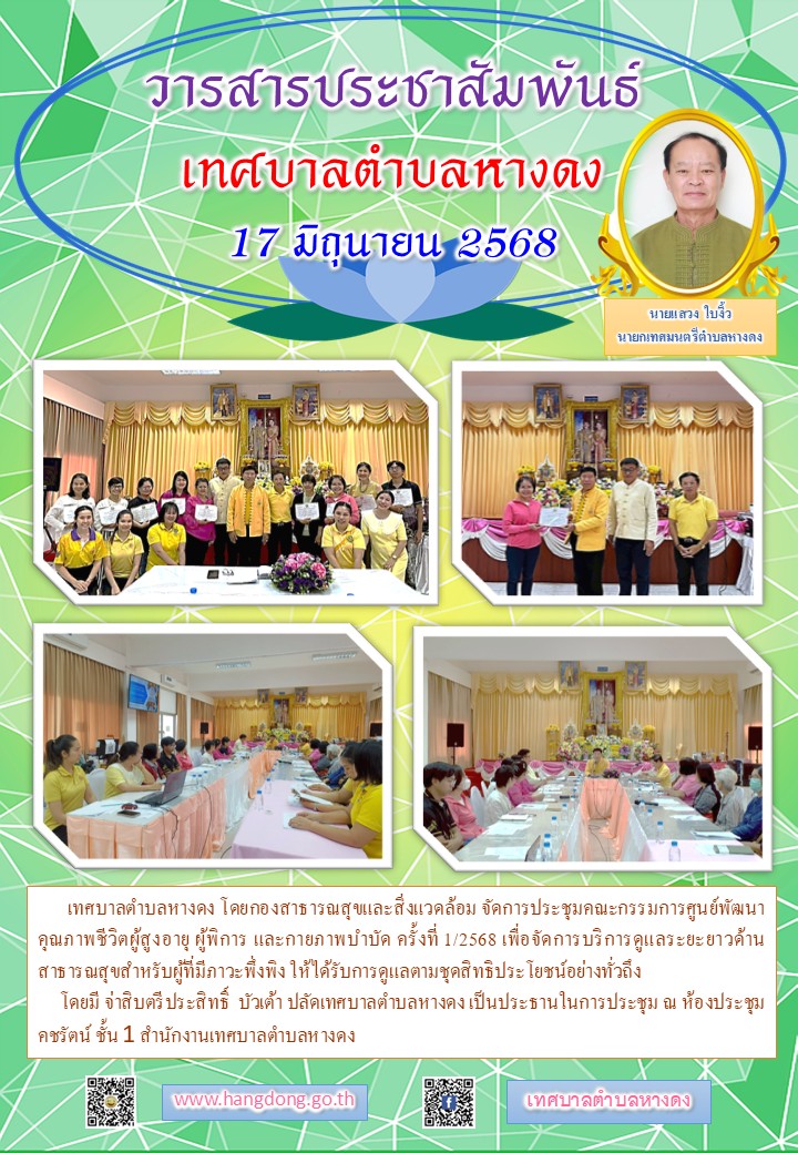 วันที่ 17 มิถุนายน 2568 เทศบาลตำบลหางดง โดยกองสาธารณสุขและสิ่งแวดล้อม จัดการประชุมคณะกรรมการศูนย์พัฒนาคุณภาพชีวิตผู้สูงอายุ ผู้พิการ และกายภาพบำบัด ครั้งที่ 1/2568 เพื่อจัดการบริการดูแลระยะยาวด้านสาธารณสุขสำหรับผู้ที่มีภาวะพึ่งพิง ให้ได้รับการดูแลตามชุดสิทธิประโยชน์อย่างทั่วถึง