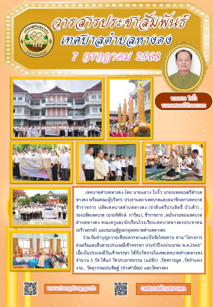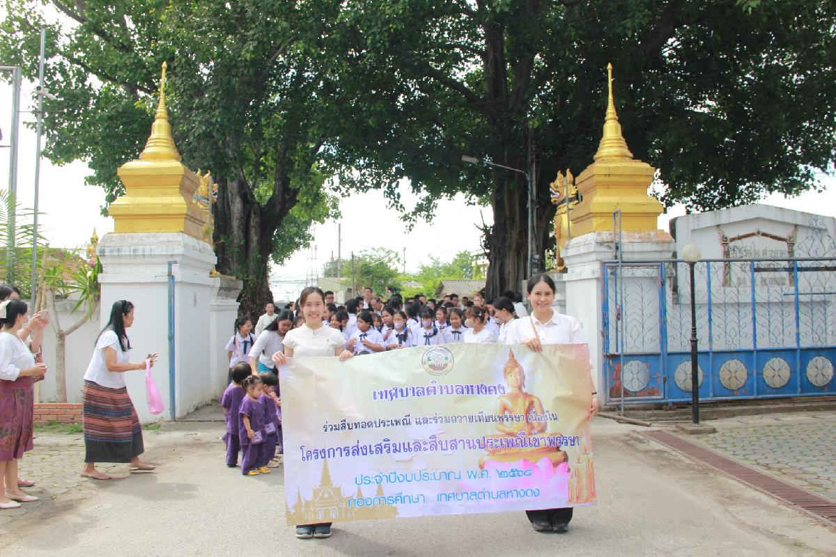 7 กรกฎาคม 2568 เทศบาลตำบลหางดง โดย นายแสวง ใบงิ้ว นายกเทศมนตรีตำบลหางดง พร้อมคณะผู้บริหาร ประธานสภาเทศบาลและสมาชิกสภาเทศบาล ข้าราชการ ปลัดเทศบาลตำบลหางดง (จ่าสิบตรีประสิทธิ์ บัวเต้า) , รองปลัดเทศบาล (นายพิทักษ์ กาวิละ), ข้าราชการ ,พนักงานของเทศบาลตำบลหางดง คณะครูและนักเรียนโรงเรียนเทศบาลหางดงประชาคม(สร้างสรรค์) และชมรมผู้สูงอายุเทศบาลตำบลหางดง ร่วมกันทำบุญถวายเทียนพรรษาและปัจจัยไทยทาน ตาม”โครงการส่งเสริมและสืบสานประเพณีเข้าพรรษา ประจำปีงบประมาณ พ.ศ.2568”เนื่องในประเพณีวันเข้าพรรษา ให้กับวัดภายในเขตเทศบาลตำบลหางดง จำนวน 5 วัด ได้แก่ วัดประสาทธรรม (แม่ขัก) ,วัดทรายมูล ,วัดกำแพงงาม , วัดสุวรรณประดิษฐ์ (ช่างคำน้อย) และวัดหางดง