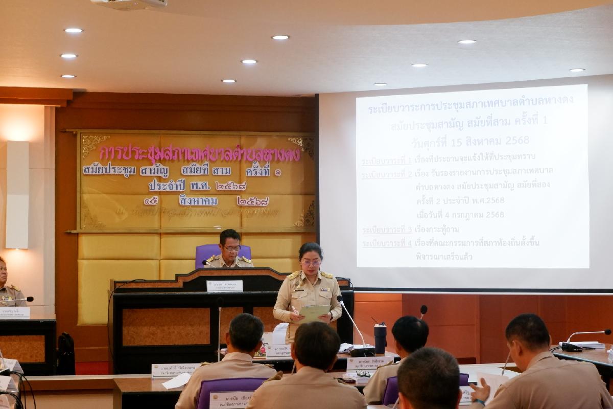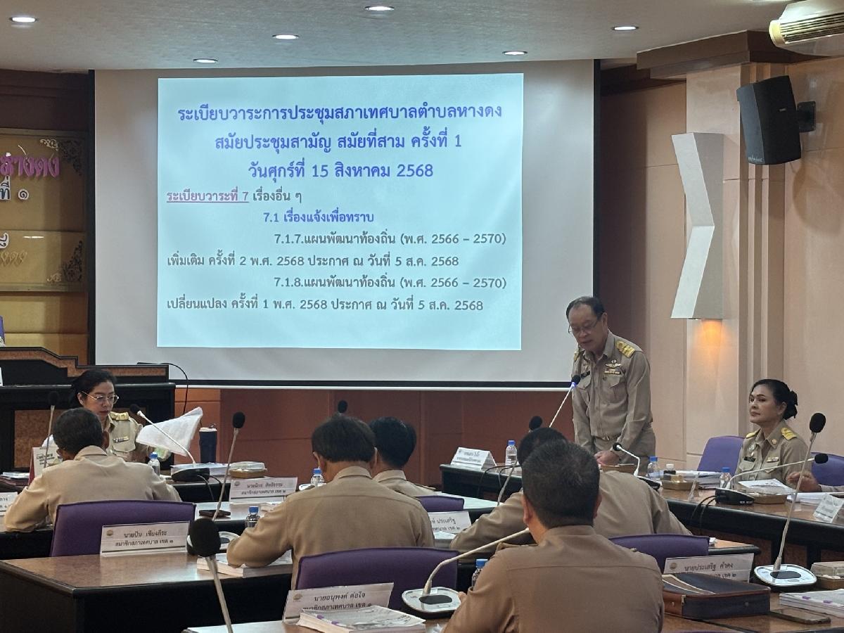 15 สิงหาคม 2568 นายจาตุรนต์ ดวงแสง ประธานสภาเทศบาลตำบลหางดง เรียกประชุมสภาเทศบาลตำบลหางดง สมัยประชุมสามัญ สมัยที่สาม ครั้งที่ 1 ประจำปี พ.ศ. 2568 โดยมีคณะผู้บริหาร ,สมาชิกสภาเทศบาล,หัวหน้าส่วนราชการและผู้ใหญ่บ้านในเขตเทศบาลตำบลหางดง เข้าร่วมการประชุมโดยพร้อมเพรียงกัน