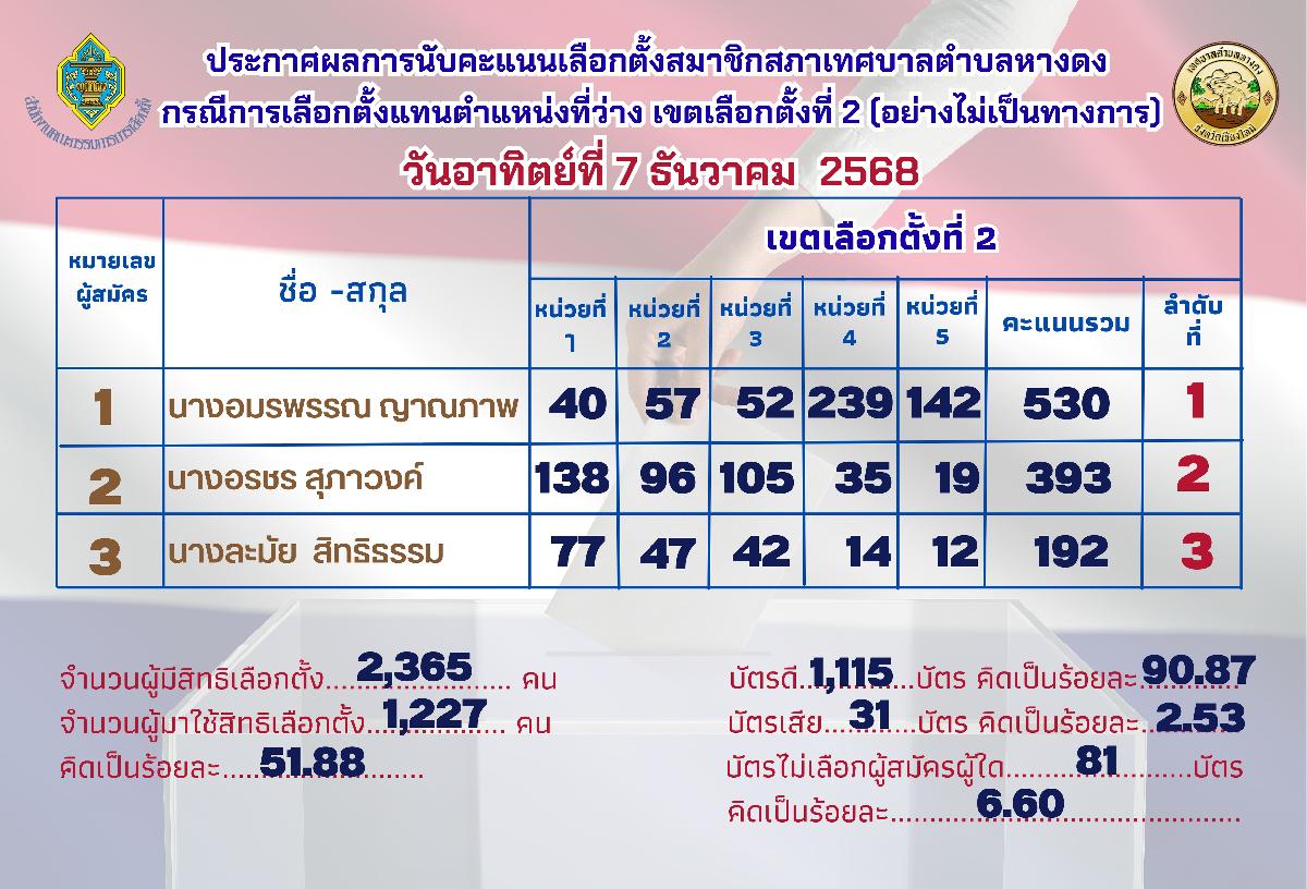 เทศบาลตำบลหางดง ขอเผยแพร่ผลการนับคะแนนเลือกตั้งสมาชิกสภาเทศบาล (แทนตำแหน่งที่ว่าง) เขตเลือกตั้งที่ 2 อย่างไม่เป็นทางการ ซึ่งได้ดำเนินการเสร็จสิ้นเป็นที่เรียบร้อย โดยมีผลการเลือกตั้งดังนี้