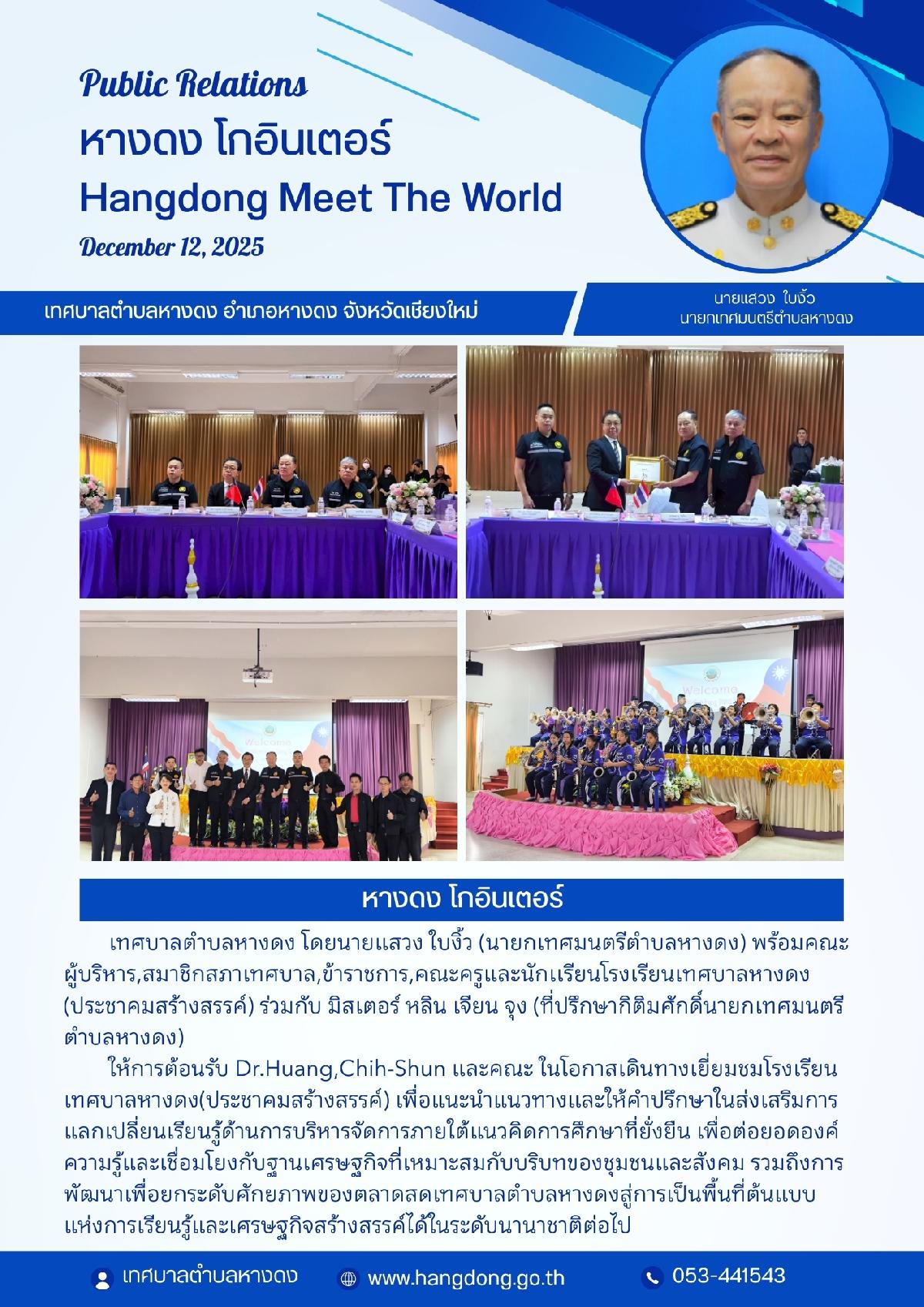 ให้การต้อนรับ Dr.Huang,Chih-Shun และคณะ ในโอกาสเดินทางเยี่ยมชมโรงเรียนเทศบาลหางดง(ประชาคมสร้างสรรค์) เพื่อแนะนำแนวทางและให้คำปรึกษาในส่งเสริมการ แลกเปลี่ยนเรียนรู้ด้านการบริหารจัดการภายใต้แนวคิดการศึกษาที่ยั่งยืน เพื่อต่อยอดองค์ความรู้และเชื่อมโยงกับฐานเศรษฐกิจที่เหมาะสมกับบริบทของชุมชนและสังคม รวมถึงการพัฒนาเพื่อยกระดับศักยภาพของตลาดสดเทศบาลตำบลหางดงสู่การเป็นพื้นที่ต้นแบบ แห่งการเรียนรู้และเศรษฐกิจสร้างสรรค์ได้ในระดับนานาชาติต่อไป
