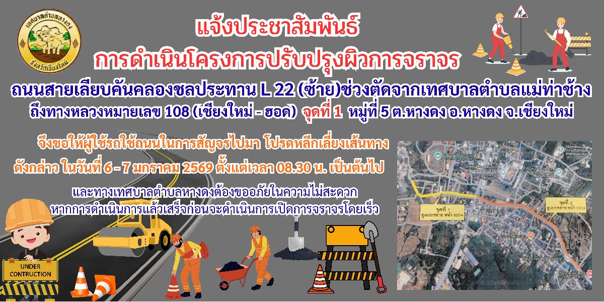 ????????ประชาสัมพันธ์การปิดการจราจรเป็นการชั่วคราว เพื่อปรับปรุงผิวการจราจรถนนสายเลียบคันคลองชลประทาน L 22 (ซ้าย)ช่วงตัดจากเทศบาลตำบลแม่ท่าช้าง ถึงทางหลวงหมายเลข 108 (เชียงใหม่ - ฮอด) จุดที่ 1 หมู่ที่ 5 ต.หางดง อ.หางดง จ.เชียงใหม่