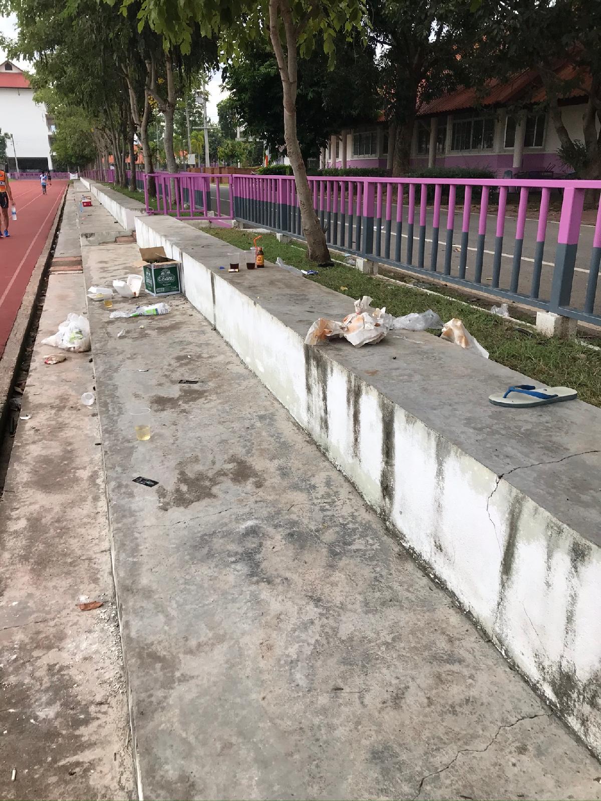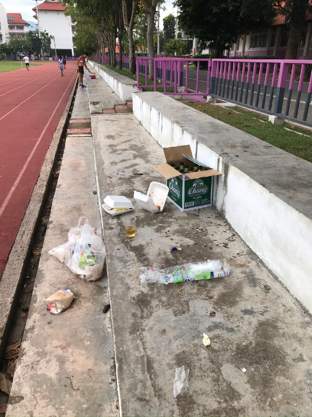 พฤติกรรมขาดจิตสำนึก ทิ้งขยะเกลื่อน นำเหล้าเบียร์มากินในสนาม จากผู้เล่นกีฬาฟุตบอลเมื่อวันอาทิตย์ วันจันทร์ไปออกกำลังกายตอนเช้า ขยะเกลื่อนเต็มไปหมด