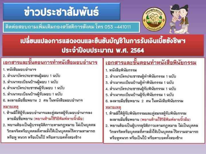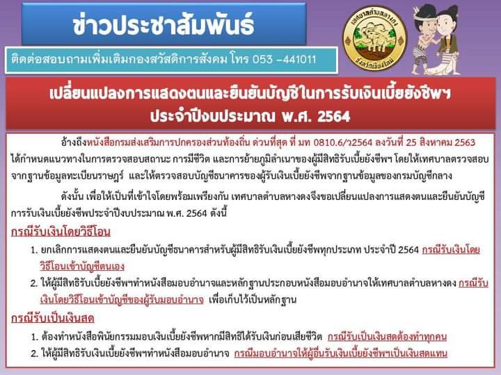 ประชาสัมพันธ์ การเปลี่ยนแปลงการแสดงตนและยืนยันบัญชีในการรับเบี้ยยังชีพ ประจำปีงบประมาณ พ.ศ. 2564