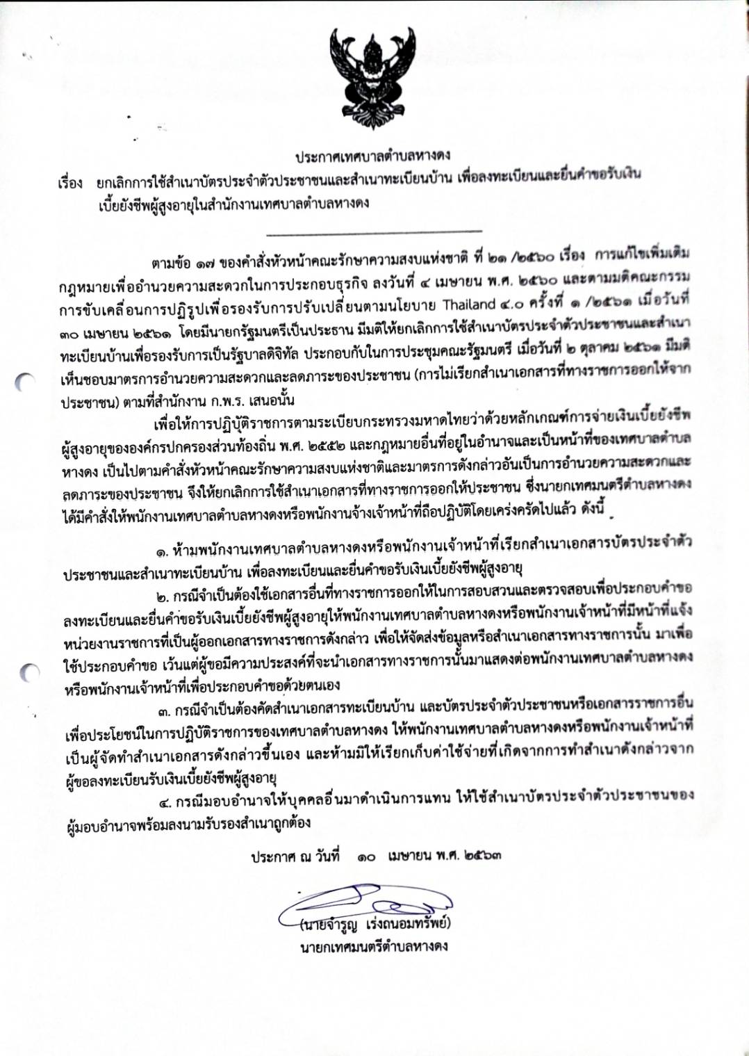 ประชาสัมพันธ์ประกาศเทศบาลตำบลหางดง เรื่องยกเลิกการใช้สำเนาบัตรประจำตัวประชาชนและสำเนาทะเบียนบ้าน เพื่อลงทะเบียนและยื่นขอรับเงินเบี้ยยังชีพผู้สูงอายุในสำนักงานเทศบาลตำบลหางดง