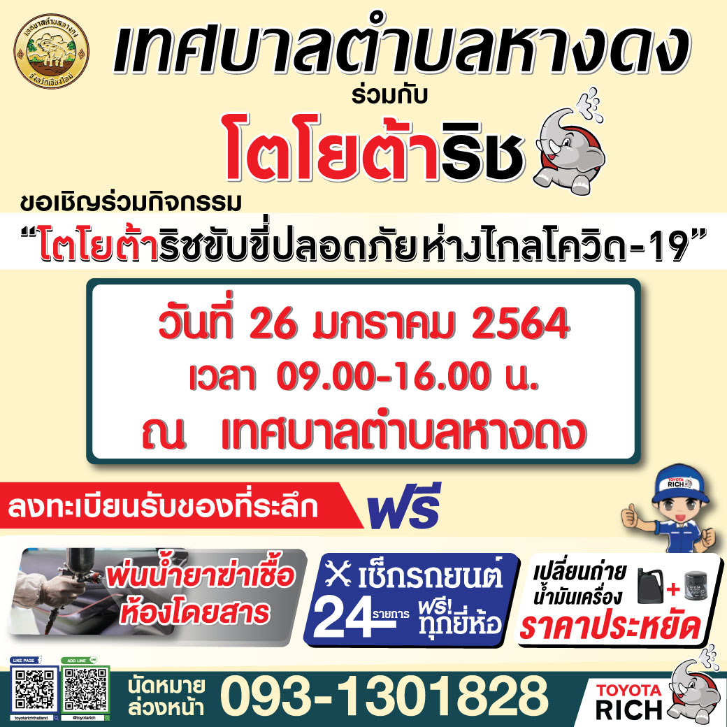 เทศบาลตำบลหางดงร่วมกับโตโยต้าริช เชิญ ร่วมกิจกรรม “โตโยต้าริชขับขี่ปลอดภัยห่างไกลโควิด-19”