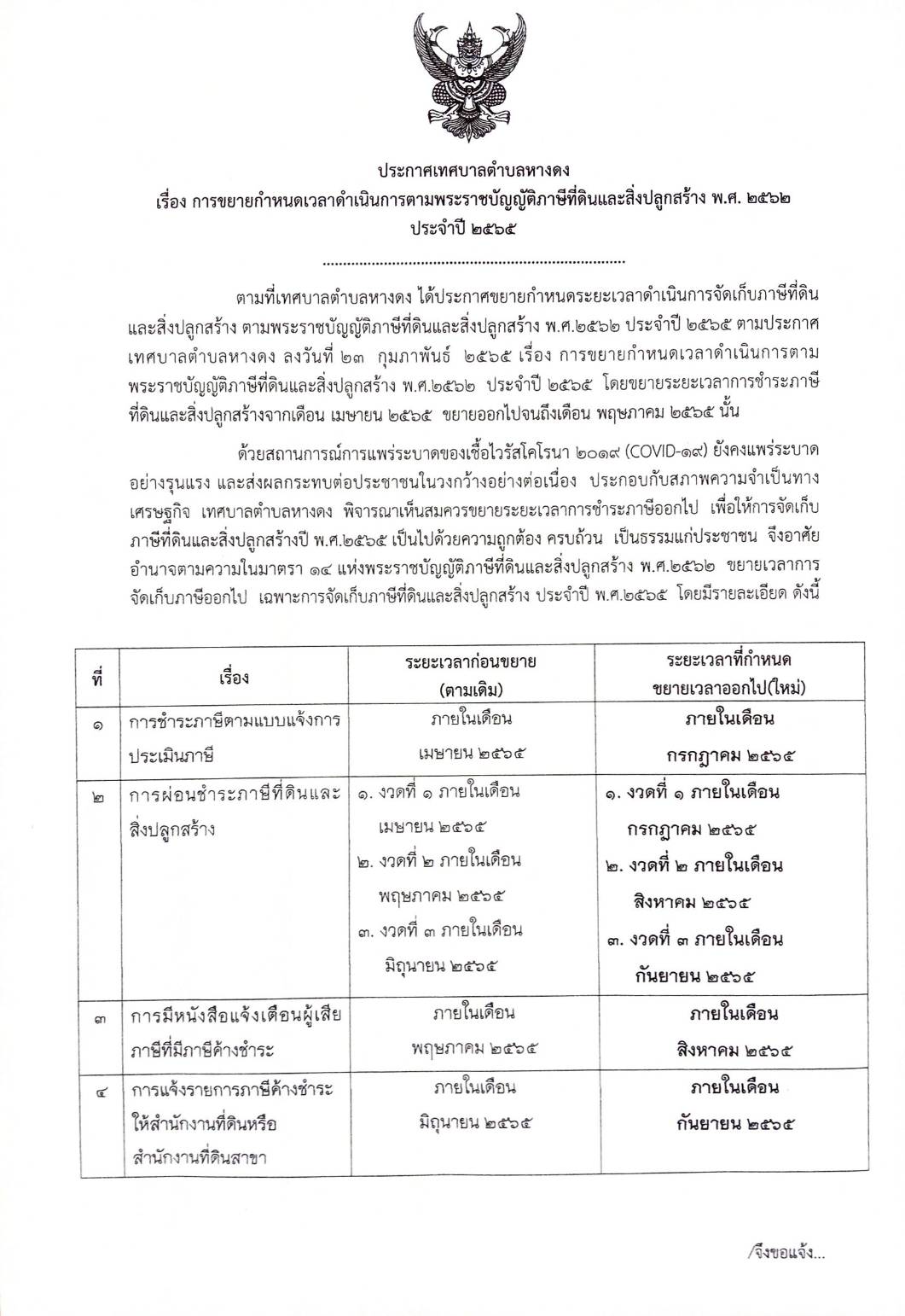 ประกาศเทศบาลตำบลหางดง เรื่อง การขยายกำหนดเวลาดำเนินการตามพระราชบัญญัติภาษีที่ดินและสิ่งปลูกสร้าง พ.ศ. 2562 ประจำปี 2565