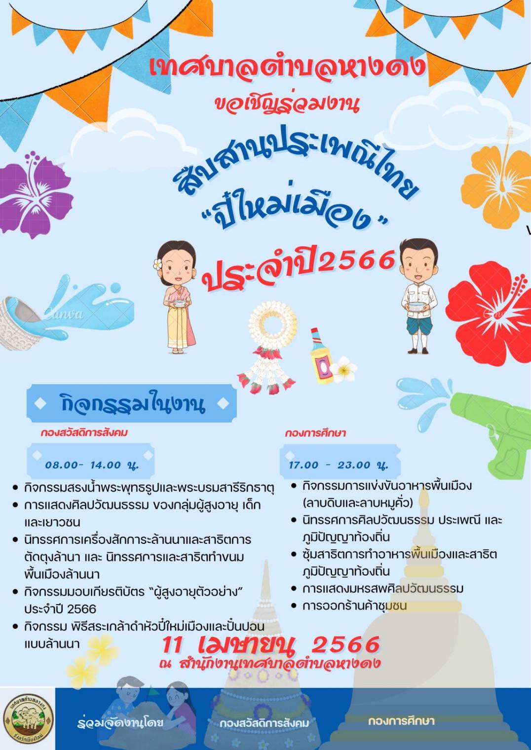 เทศบาลตำบลหางดง ขอเชิญ ร่วมงาน สืบสานประเพณี "ปี๋ใหม่เมือง" ณ สำนักงานเทศบาลตำบลหางดง ภายในงาน มีกิจกรรมมากมาย อาทิเช่น กิจกรรมการสรงน้ำพระพุทธรูปและพระบรมสารีริกธาตุ นิทรรศการและสาธิตเกี่ยวกับภูมิปัญญาประเพณีล้านนา การแสดงศิลปวัฒนธรรม ของกลุ่มผู้สูงอายุ เด็กและเยาวชน พิธีสระเกล้าดำหัวปี๋ใหม่เมือง และการแข่งขันอาหารพื้นเมือง (ลาบดิบและลาบคั่ว) จากทุกทีมทุกหมู่บ้านในเขตตำบลหางดง การแสดงมหรสพศิลปวัฒนธรรม และการออกร้านค้าชุมชน โดยกิจกรรมเริ่มตั้งแต่เวลา 08.30 น.-23.00 น.