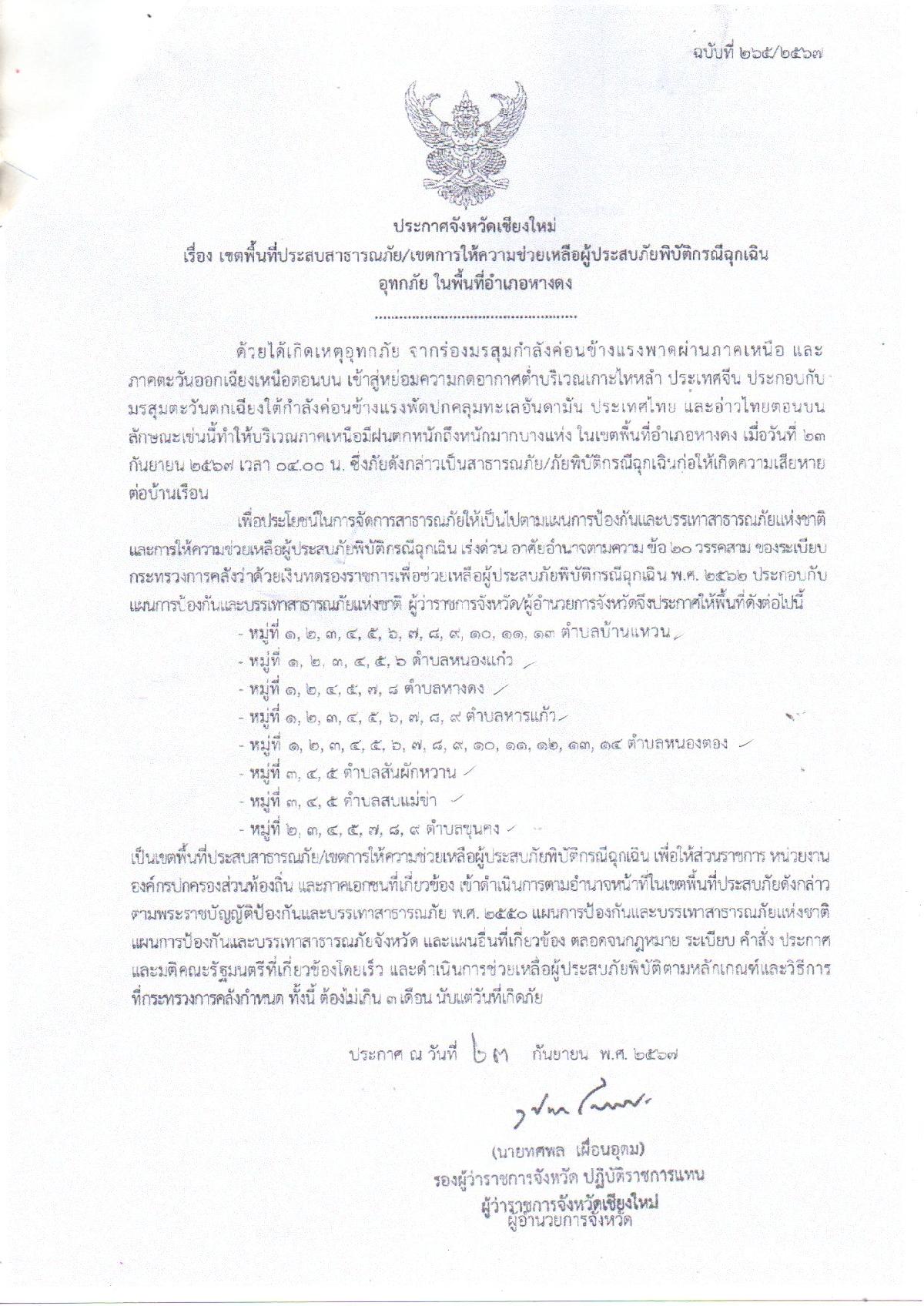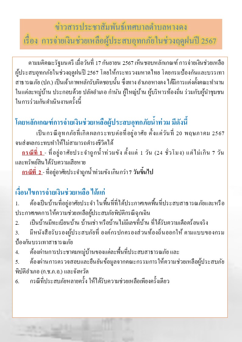ประชาสัมพันธ์ เรื่องการยื่นแบบฟอร์มขอรับเงินช่วยเหลือกรณีเกิดอุทกภัยในช่วงฤดูฝน ประจำปี 2567 (พื้นที่ ทต.หางดง)