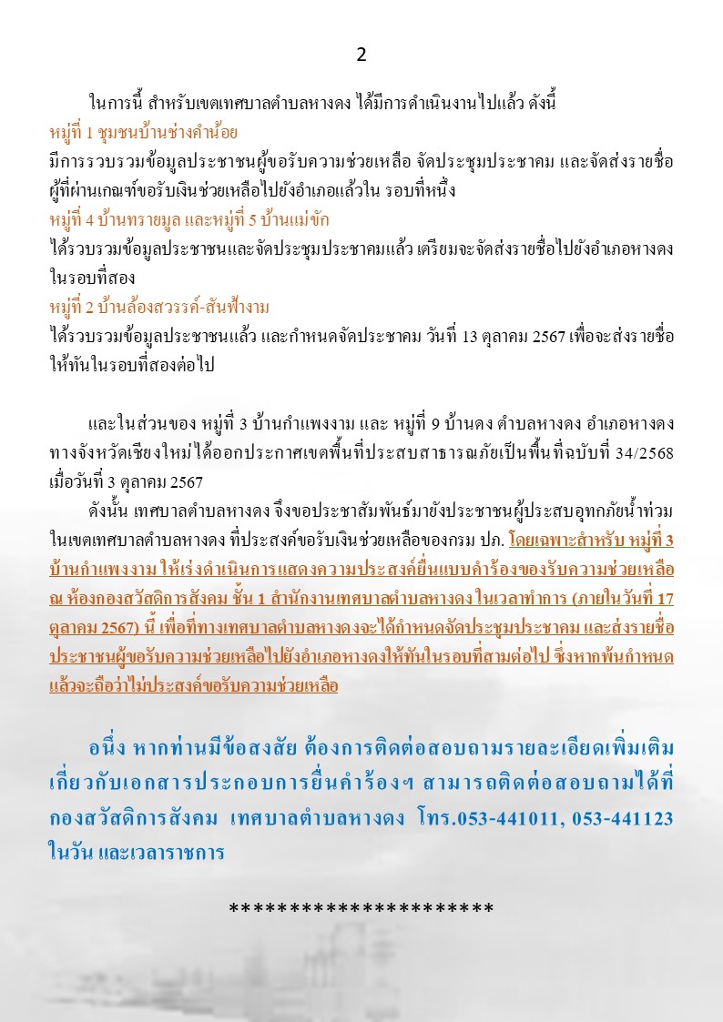 ประชาสัมพันธ์ เรื่องการยื่นแบบฟอร์มขอรับเงินช่วยเหลือกรณีเกิดอุทกภัยในช่วงฤดูฝน ประจำปี 2567 (พื้นที่ ทต.หางดง) รายละเอียดตามเอกสารที่แนบมาพร้อมนี้คะ