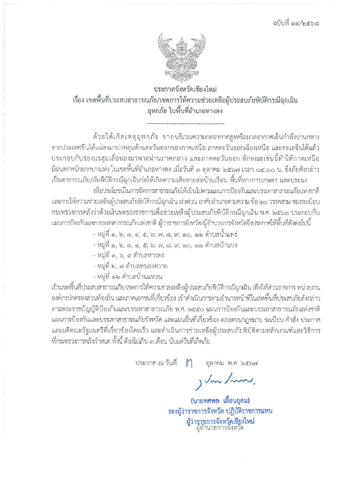 ประกาศผู้อำนวยการเลือกตั้งประจำเทศบาลตำบลหางดง เรื่อง ให้มีการเลือกตั้งนายกเทศมนตรีตำบลหางดง