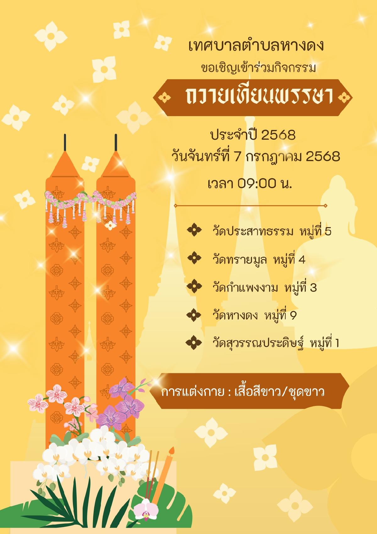 ประชาสัมพันธ์ เทศบาลตำบลหางดง ขอเชิญพี่น้องประชาชนร่วมกิจกรรมถวายเทียนพรรษา