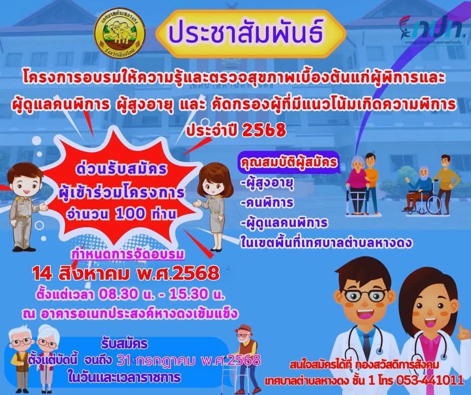 เทศบาลตำบลหางดง โดยกองสวัสดิการสังคม รับสมัคร ผู้ที่สนใจเข้ารับการฝึกอบรม ตามโครงการอบรมให้ความรู้และตรวจสุขภาพเบื้องต้นแก่ผู้พิการและผู้ดูแลคนพิการ ผู้สูงอายุ และ คัดกรองผู้ที่มีแนวโน้มเกิดความพิการ