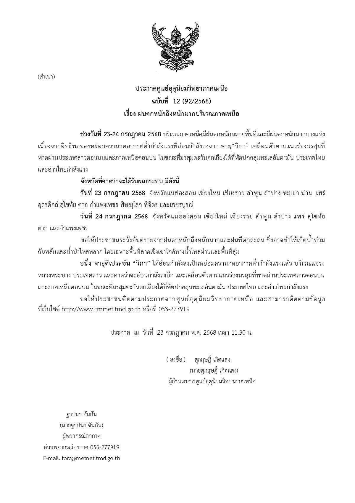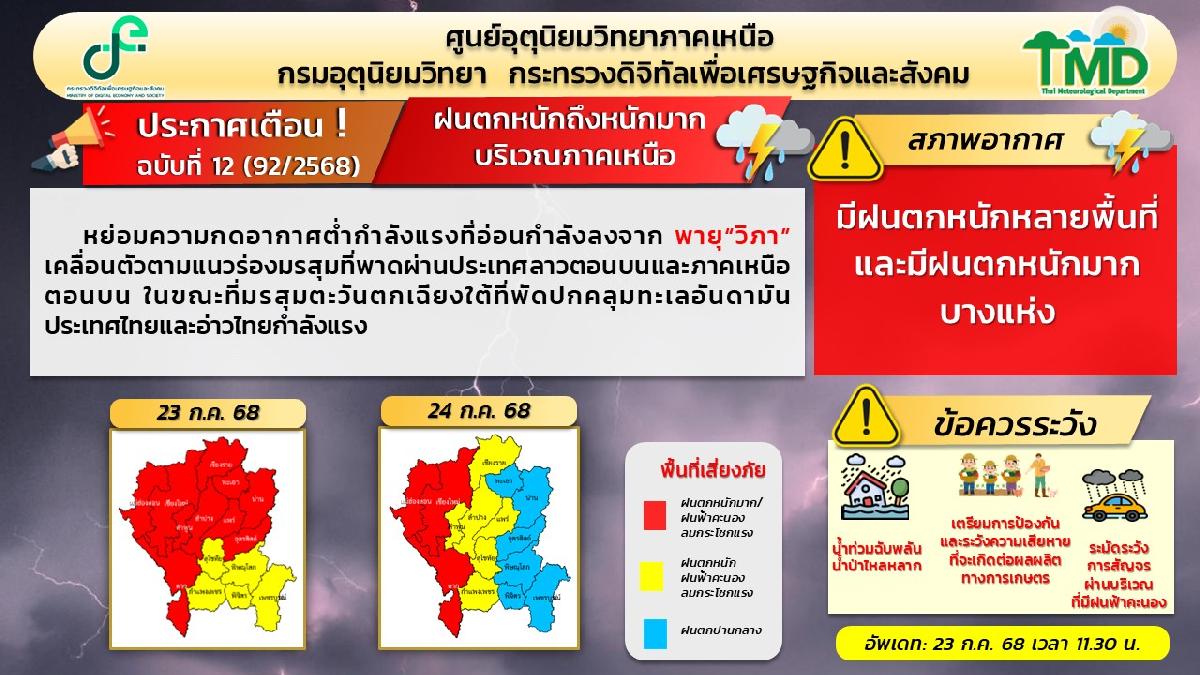 ประกาศแจ้งเตือนภัยฝนตกหนักถึงหนักมากบริเวณภาคเหนือ