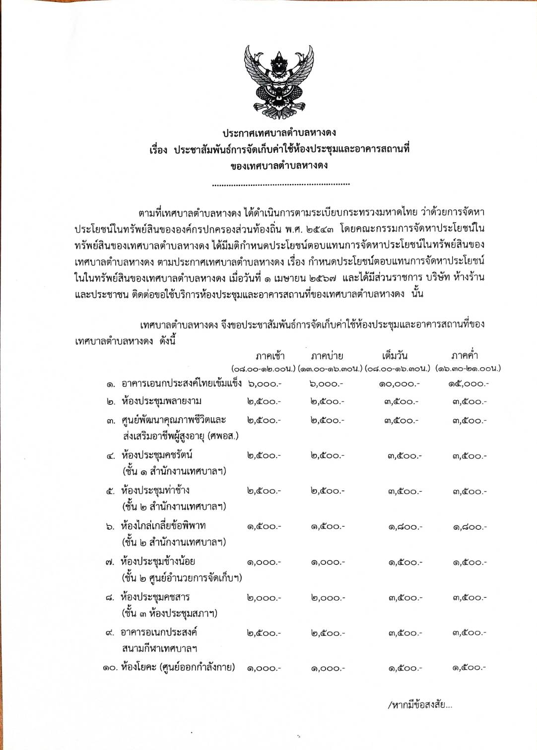 ประกาศเทศบาลตำบลหางดง เรื่อง ประชาสัมพันธ์การจัดเก็บค่าใช้ห้องประชุมและอาคารสถานที่ของเทศบาลตำบลหางดง