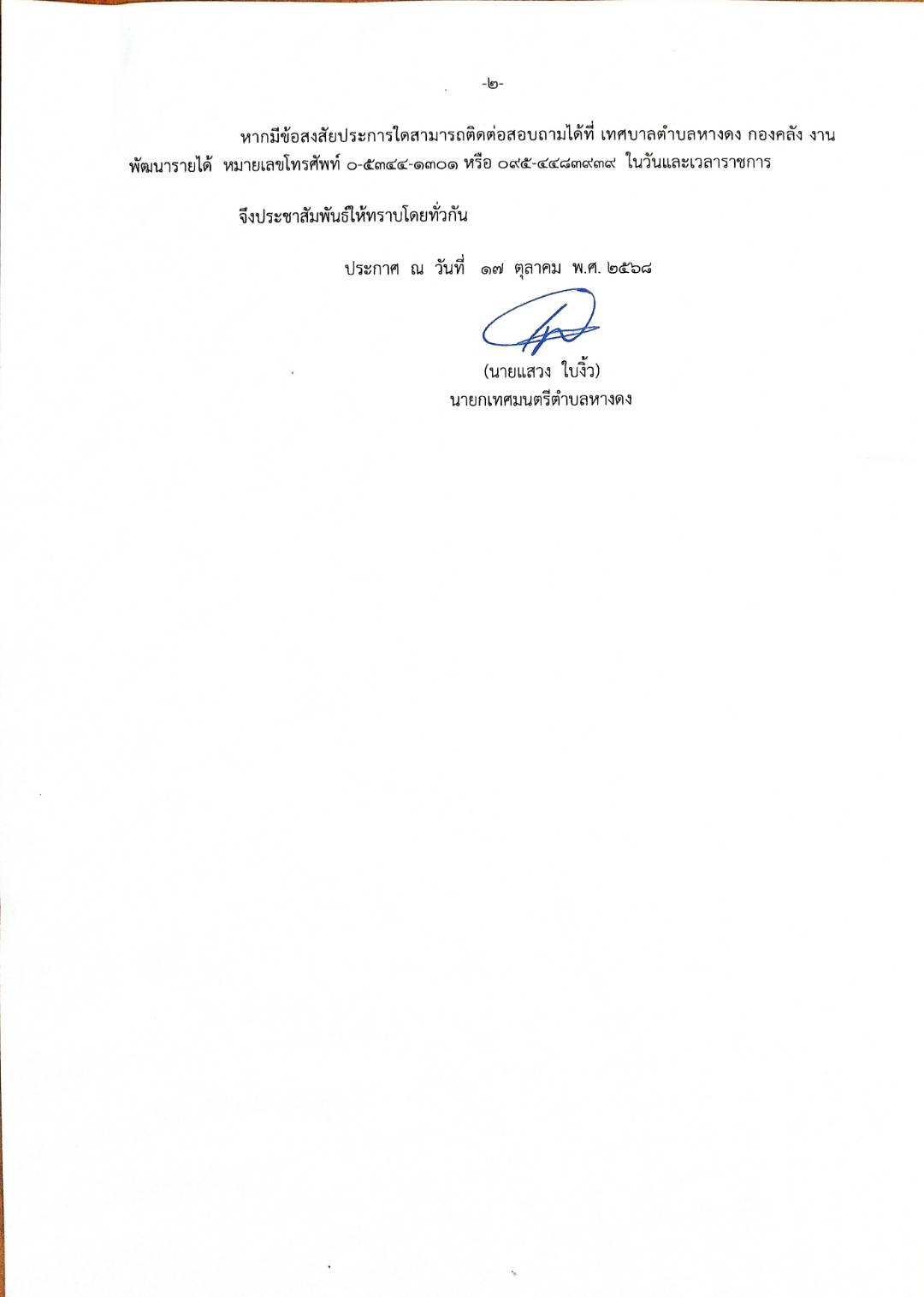 ประกาศเทศบาลตำบลหางดง