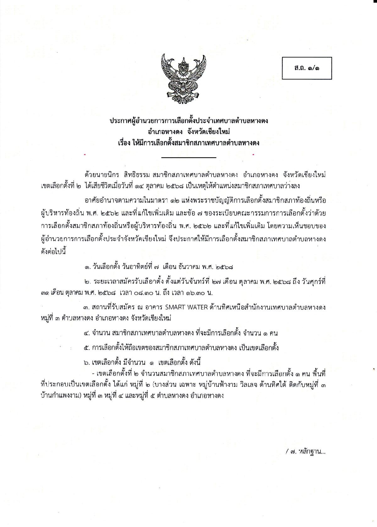 ประกาศผู้อำนวยการเลือกตั้งประจำเทศบาลตำบลหางดง เรื่อง ให้มีการเลือกตั้งนายกเทศมนตรีตำบลหางดง