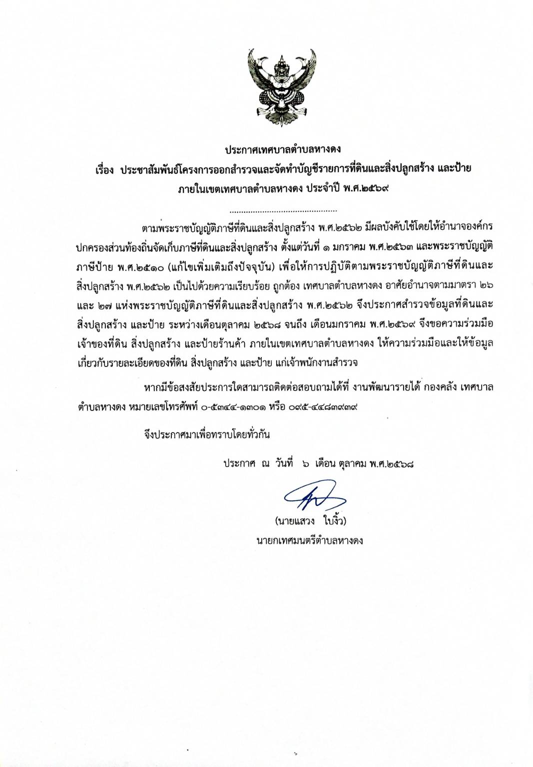 ประกาศเทศบาลตำบลหางดง เรื่อง ประชาสัมพันธ์โครงการออกสำรวจและจัดทำบัญชีรายการที่ดินและสิ่งปลูกสร้างและป้าย ภายในเขตเทศบาลตำบลหางดง ประจำปี พ.ศ. 2569