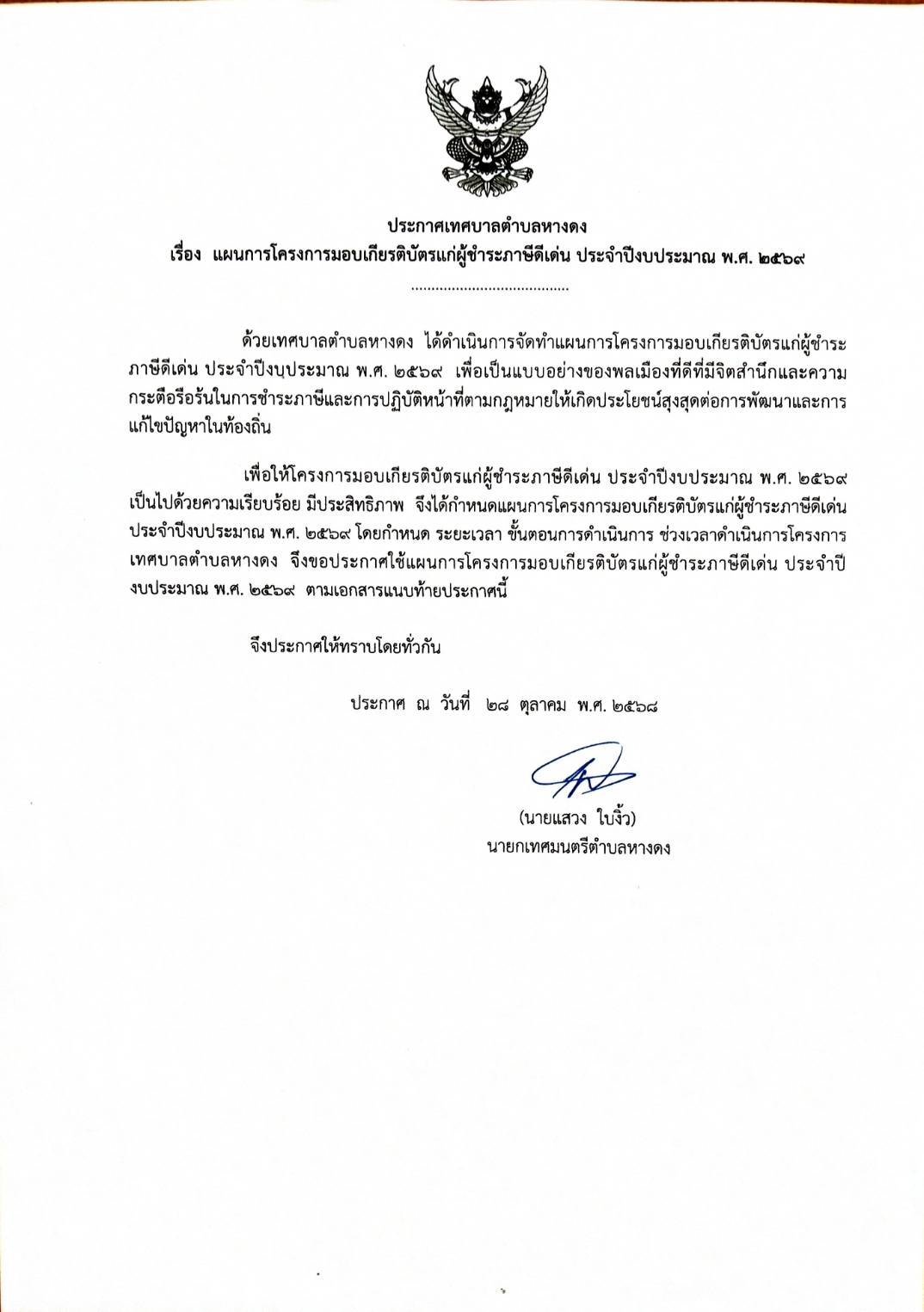 ประกาศเทศบาลตำบลหางดง เรื่อง แผนการโครงการมอบเกียรติบัตรแก่ผู้ชำระภาษีดีเด่น ประจำปีงบประมาณ พ.ศ. 2569