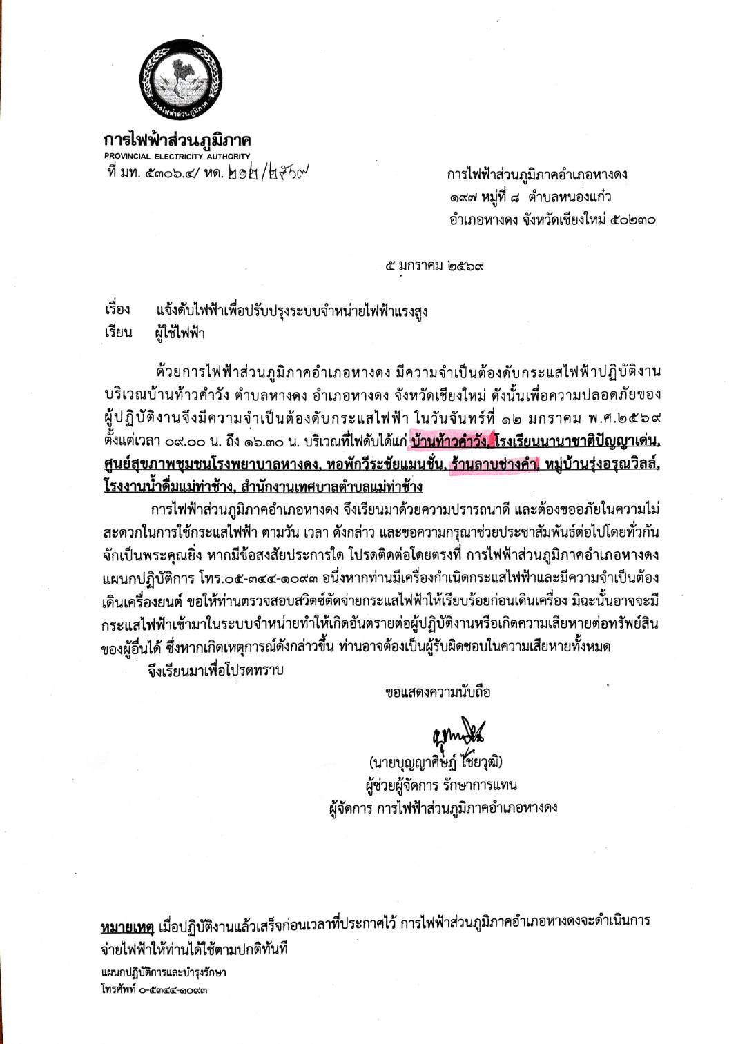 ประชาสัมพันธ์จากการไฟฟ้าส่วนภูมิภาคอำเภอหางดง เรื่อง แจ้งดับไฟฟ้าเป็นการชั่วคราวเพื่อปรับปรุงระบบจำหน่ายไฟฟ้าแรงสูง