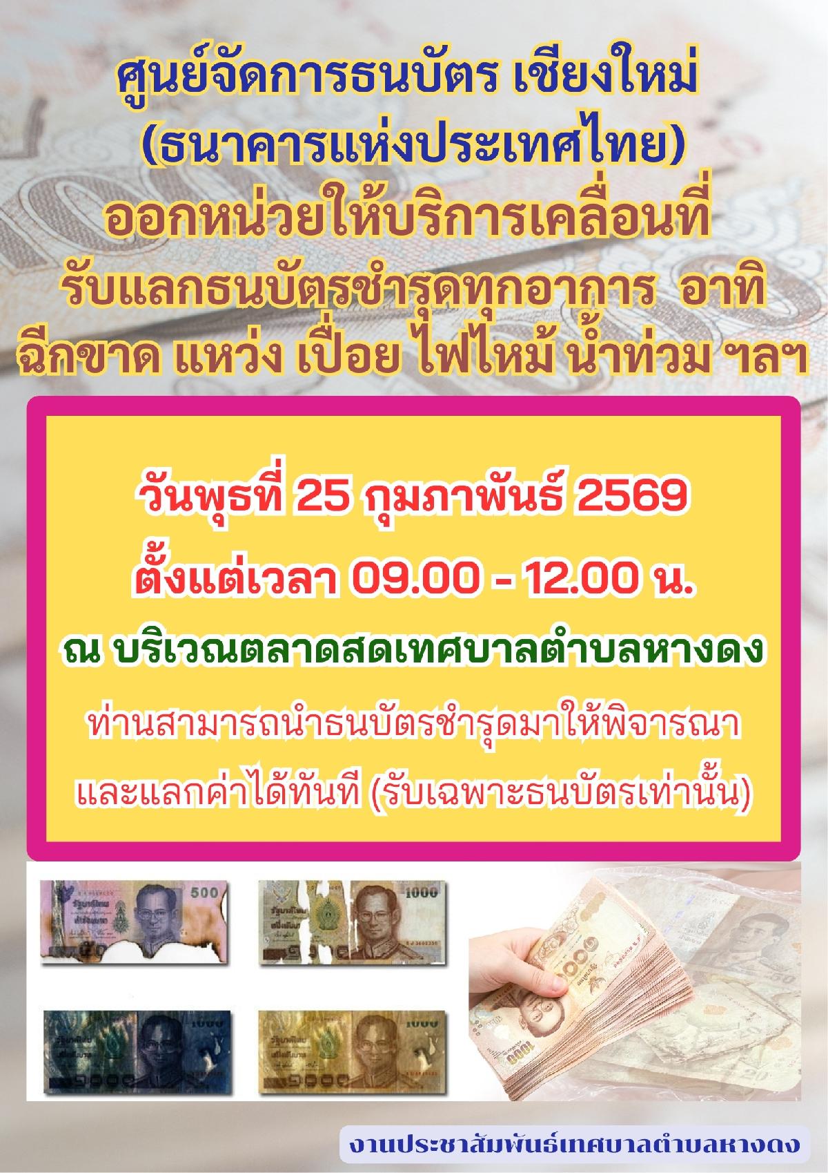 ศูนย์จัดการธนบัตร เชียงใหม่ ธนาคารแห่งประเทศไทย เปิดคลีนิคธนบัตร# รับแลกธนบัตรชำรุด# ให้กับพี่น้องประชาชนที่มีธนบัตรชำรุดทุกอาการ อาทิ ฉีกขาด เก่า เน่าเปื่อยไฟไหม้ ฯลฯ สามารถนำธนบัตรดังกล่าว มาขอแลกเปลี่ยนเป็นธนบัตรหมุนเวียนไว้ใช้ได้ ในวันพุธ ที่ 25 กุมภาพันธ์ 2569 ตั้งแต่เวลา 09.00 น. - 12.00 น. ณ ตลาดสดเทศบาลตำบลหางดง อำเภอหางดง จังหวัดเชียงใหม่