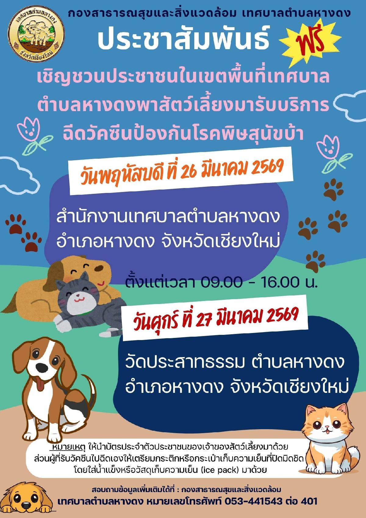 กองสาธารณสุขและสิ่งแวดล้อม เทศบลตำบลหางดง จัดกิจกรรมให้บริการฉีดวัคซีนป้องกันโรคพิษสุนัขบ้า ให้แก่สุนัขและแมว ภายในเขตพื้นที่รับผิดชอบ ตามโครงการป้องกันและควบคุมโรคพิษสุนัขบ้า ประจำปี พ.ศ.2569 ภายใต้โครงการสัตว์ปลอดโรค คนปลอดภัย จากโรคพิษสุนัขบ้า ตามพระปณิธานศาสตราจารย์ ดร.สมเด็จเจ้าฟ้าฯกรมพระศรีสวางควัฒน วรขัตติยราชนารี ปีงบประมาณ 2569